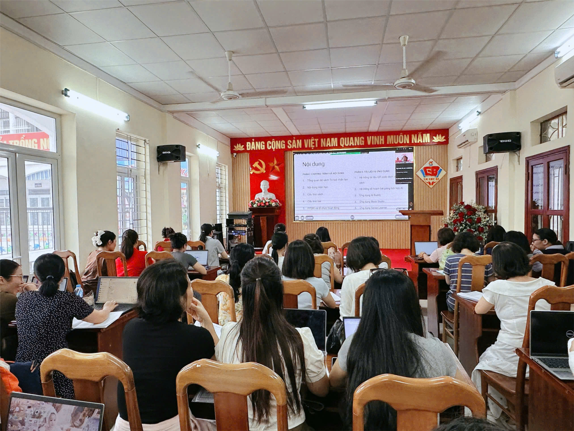 Thực hiện kế hoạch tập huấn của Sở Giáo dục và Đào tạo Hải Phòng, sáng ngày 04/10/2025, Trường Tiểu học Cát Bi đã tổ chức buổi tập huấn bộ tài liệu “Trí tuệ nhân tạo từ lớp 1 đến lớp 12” tại Phòng Hội trường nhà trường.