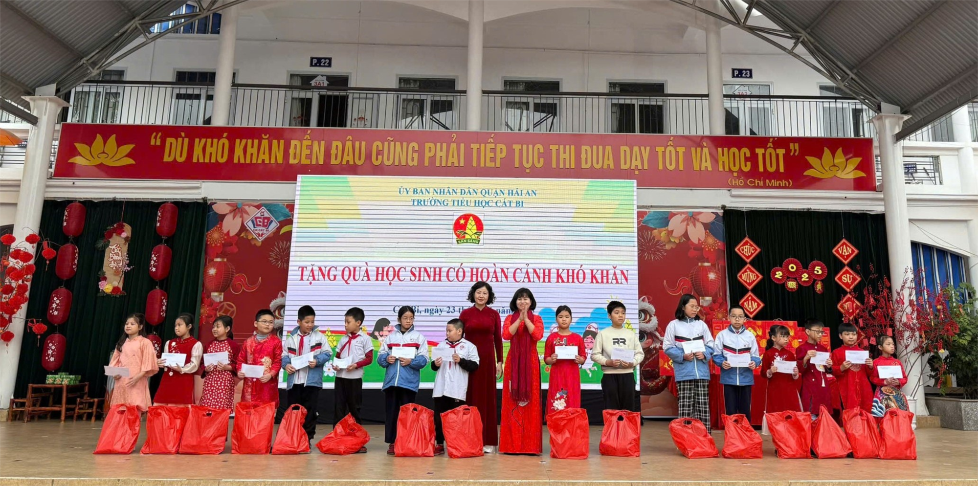 Nhà trường xin gửi lời cảm ơn sâu sắc tới Hội Khuyến học Thành phố Hải Phòng, UBND phường, Ủy ban Mặt trận Tổ quốc Việt Nam phường Cát Bi, Hội cha mẹ học sinh Trường Tiểu học Cát Bi, Công ty trách nhiệm hữu hạn LG Display Việt Nam tại Hải Phòng, Công ty TNHH chế biến và cung cấp thực phẩm New Green và tất cả các nhà hảo tâm, các thầy cô giáo đã gửi những phần quà ý nghĩa đến tận tay các em. Với sự đồng lòng của cộng đồng, nhà trường tin rằng mùa xuân này sẽ là mùa xuân trọn vẹn, đáng nhớ đối với các em.