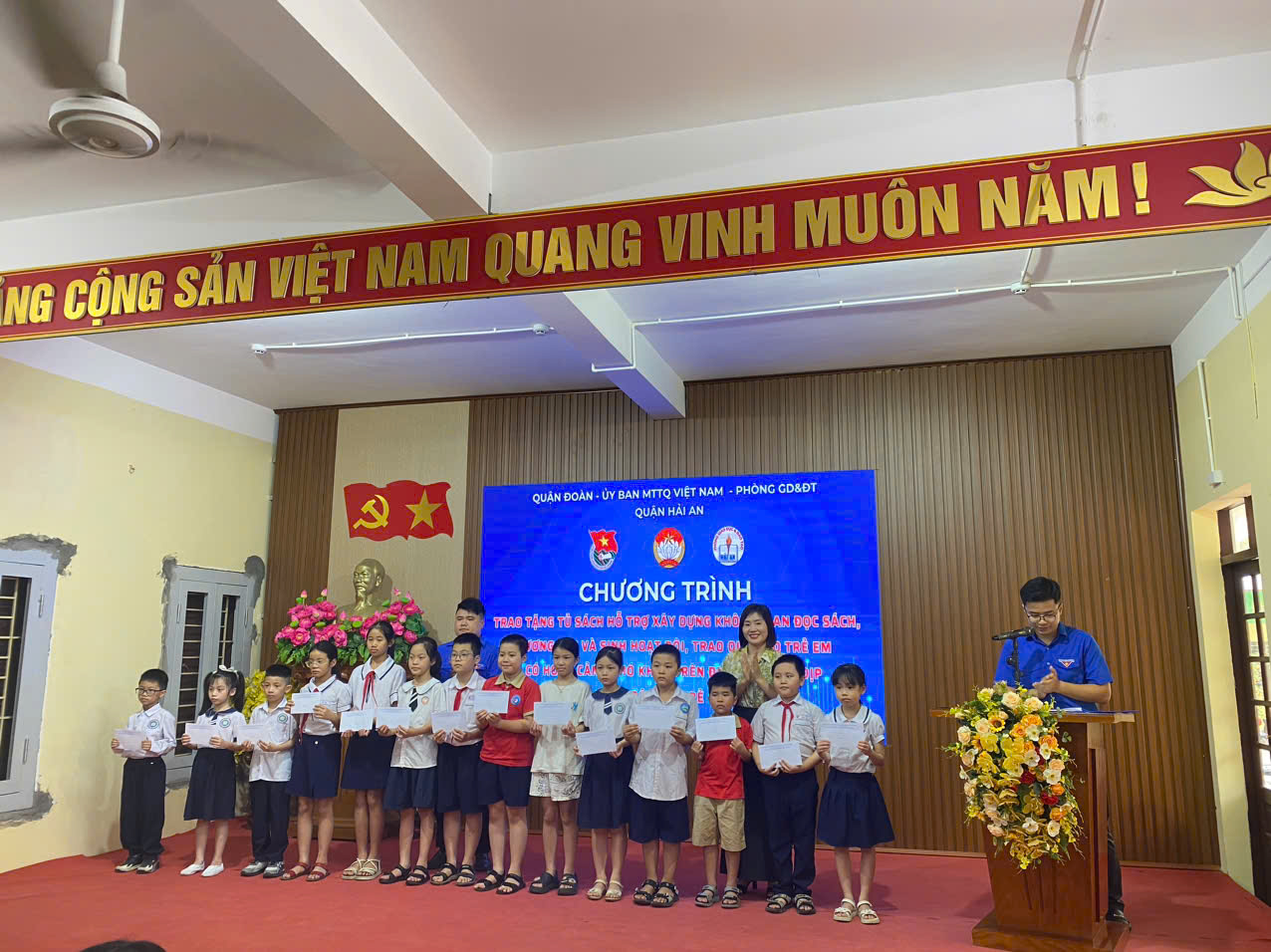 Thực hiện Chương trình công tác Đoàn và phong trào thanh thiếu nhi năm 2025; Kế hoạch số 171/KH-UBND ngày 21/05/2025 của Ủy ban nhân dân quận Hải An về triển khai Tháng hành động vì trẻ em năm 2025; Kế hoạch số 184/KH-UBND ngày 30/05/2025 của Uỷ ban nhân dân quận Hải An về hoạt động hè 2025; Ban Thường vụ Quận đoàn phối hợp Uỷ ban MTTQ Việt Nam, phòng Giáo dục và Đào tạo quận Hải An tổ chức Chương trình trao tặng tủ sách hỗ trợ xây dựng không gian đọc sách, tương tác và sinh hoạt Đội, trao quà cho thiếu nhi có hoàn cảnh khó khăn trên địa bàn nhân dịp Tháng hành động vì trẻ em năm 2025 .
