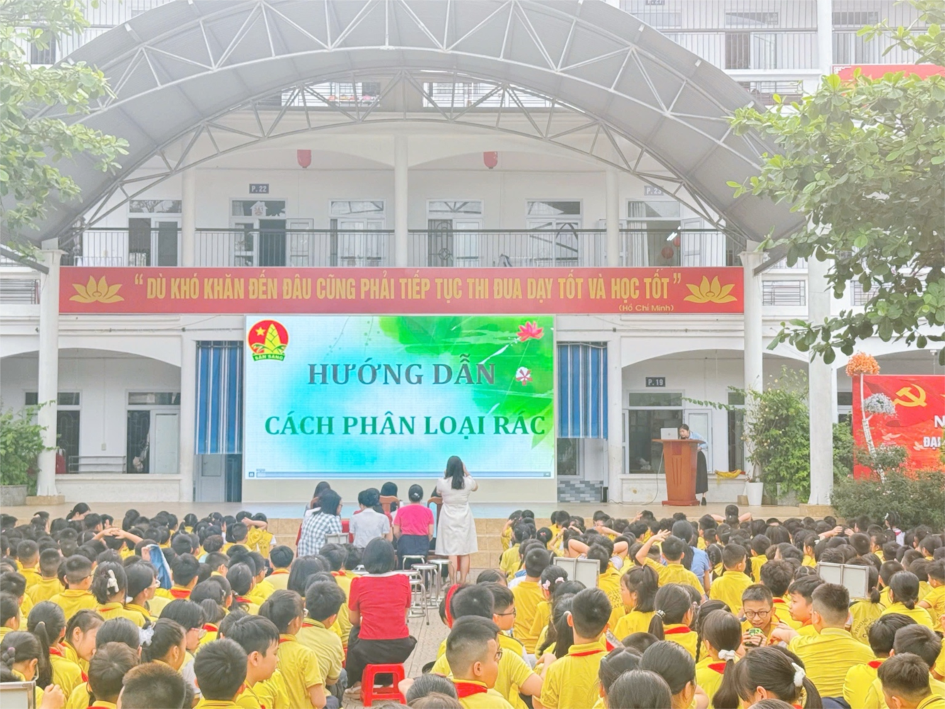 Trong các buổi sinh hoạt và hoạt động giáo dục, nhà trường đã tổ chức tuyên truyền với nhiều hình thức phong phú, trực quan như: trình chiếu video, hình ảnh minh họa, hướng dẫn cụ thể cách phân loại rác thải sinh hoạt. Qua đó, học sinh được nhận biết và phân biệt rõ các nhóm rác như: rác hữu cơ, rác tái chế và rác thải còn lại, cũng như hiểu được ý nghĩa, tầm quan trọng của việc phân loại rác tại nguồn.