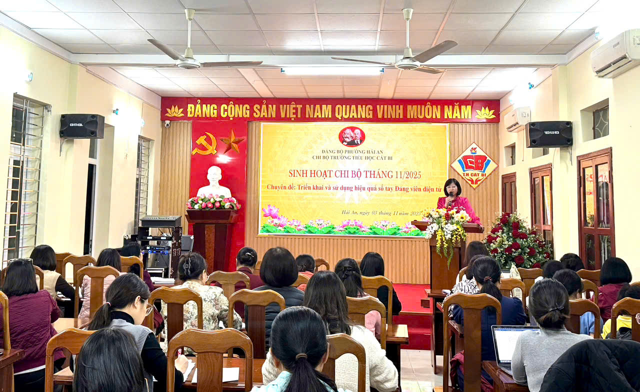 Chiều ngày 03/11/2025, Chi bộ Trường Tiểu học Cát Bi tổ chức Sinh hoạt Chi bộ thường kỳ kết hợp sinh hoạt chuyên đề tháng 11/2025. Buổi sinh hoạt diễn ra dưới sự chủ trì của đồng chí Nguyễn Thị Phương – Bí thư Chi bộ, với sự tham dự của 57/57 đảng viên trong chi bộ nhà trường.
