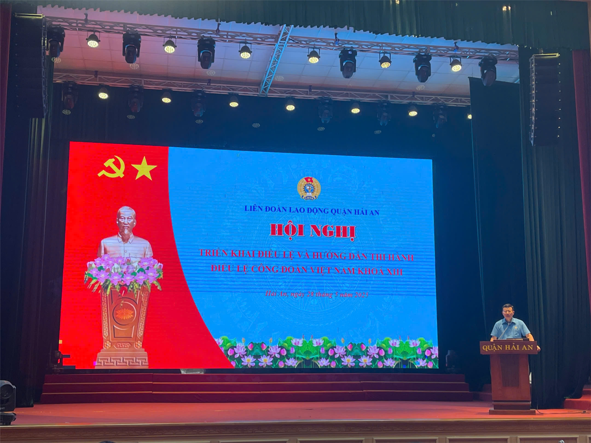Thực hiện Nghị quyết Đại hội XIII Công đoàn Việt Nam; Nghị Quyết Đại hội XV Công đoàn thành phố; Nghị quyết Đại hội V Công đoàn quận Hải An; Chương trình công tác năm 2025; Kế hoạch số 262/KH-LĐLĐ ngày 19/5/2025 của Ban Thường vụ Liên đoàn Lao động thành phố Hải Phòng. Hôm nay, Liên đoàn Lao động quận Hải An tổ chức Hội nghị tập huấn, triển khai Điều lệ và Hướng dẫn thi hành Điều lệ Công đoàn Việt Nam (Khoá XIII).