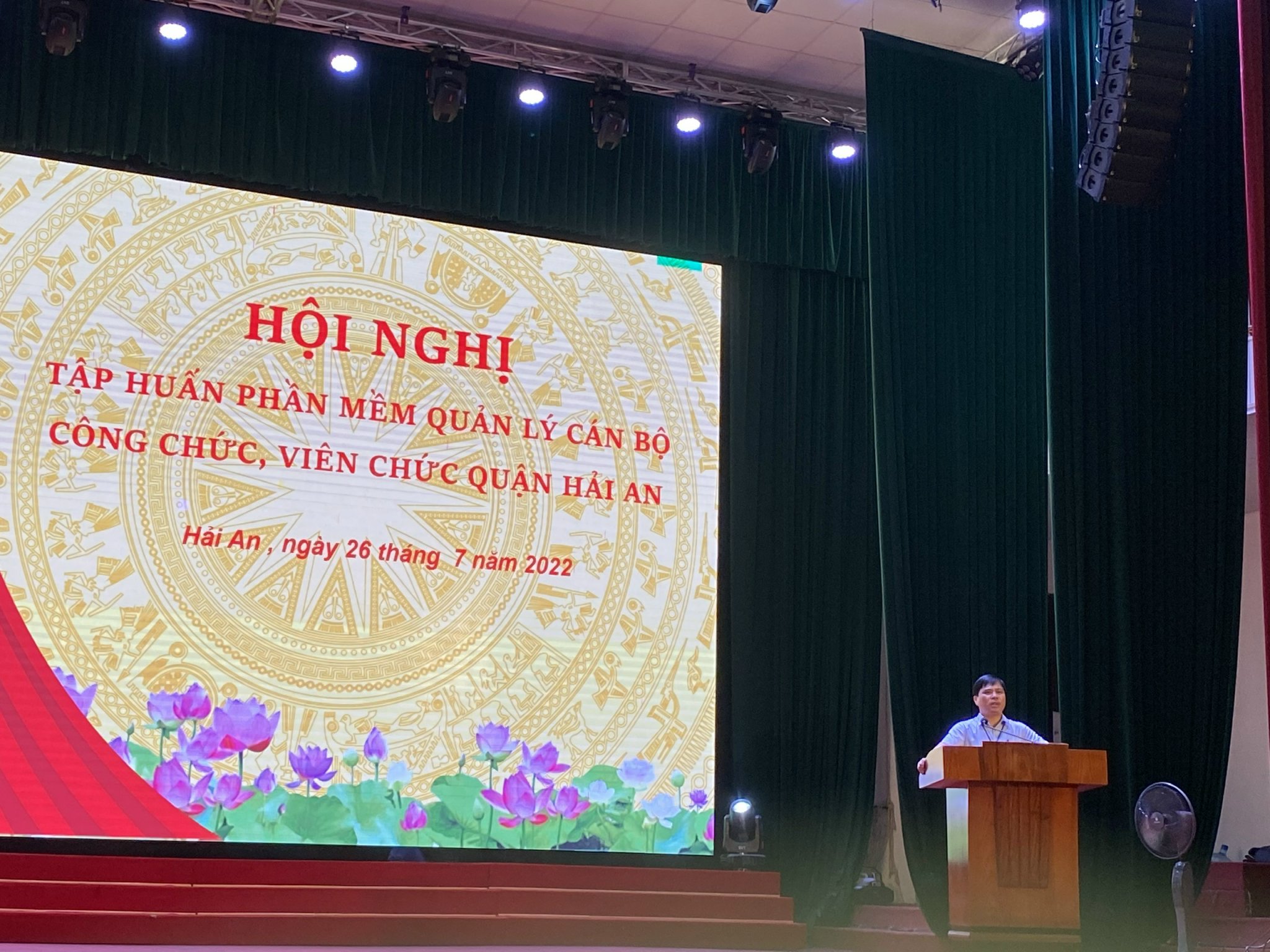 Thực hiện Quyết định số 2392/QĐ-UBND, ngày 24/8/2021 của UBND thành phố Hải Phòng về việc phê duyệt Đề cương và dự toán chi tiết hạng mục “Triển khai phần mềm quản lý cán bộ, công chức, viên chức thành phố Hải Phòng”; Công văn số 1104/SNV-CCVC ngày 03/6/2022 của Sở Nội vụ thành phố “V/v triển khai phần mềm quản lý cán bộ, công chức, viên chức thành phố Hải Phòng”, UBND quận Hải An tổ chức tập huấn sử dụng phần mềm quản lý cán bộ, công chức, viên chức quận Hải An năm 2022 vào ngày 26, 27/7/2022 tại Hội trường trung tâm quận.