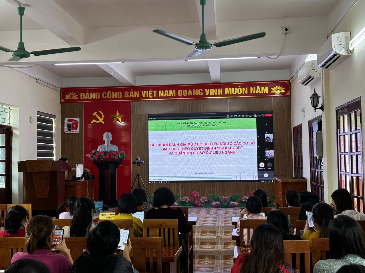 Sáng thứ sáu ngày 15/9/2023, Sở GD&ĐT Hải Phòng đã tổ chức Hội nghị “Triển khai đánh giá mức độ chuyển đổi số của cơ sở giáo dục phổ thông và giáo dục thường xuyên và tập huấn triển khai Hệ thống CSDL giáo dục và đào tạo năm học 2023 - 2024”. Về dự với Hội thảo có đ/c Bùi Văn Kiệm - Giám đốc Sở GD&ĐT, đ/c Phạm Quốc Hiệu - Phó Giám đốc Sở GD&ĐT và các đ/c Chuyên viên các phòng trực thuộc Sở GD&ĐT: KHTC, GDMN, GDTH, GDTrH, GDTX&ĐH; Đại diện lãnh đạo, cán bộ phụ trách chuyển đổi số và Hệ thống CSDL GDĐT các cơ sở giáo dục trực thuộc Sở GDĐT, các TT GDNN-GDTX trên địa bàn các quận: Ngô Quyền, Hải An, Lê Chân, Hồng Bàng; Đại diện Cục CNTT - Bộ GDĐT và Công ty Cổ phần CNPM Quảng Ích