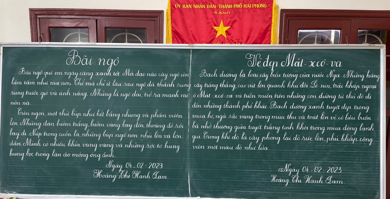 Giao lưu giáo viên viết chữ đẹp Tiểu học cấp quận là cơ hội để giáo viên thể hiện được sự nhiệt huyết của mình với lòng yêu nghề, yêu trẻ. Xin chúc các đồng chí giáo viên của nhà trường sẽ đạt kết quả cao trong buổi giao lưu, tô điểm thêm vào vườn hoa thành tích rực rỡ của trường Tiểu học Cát Bi.