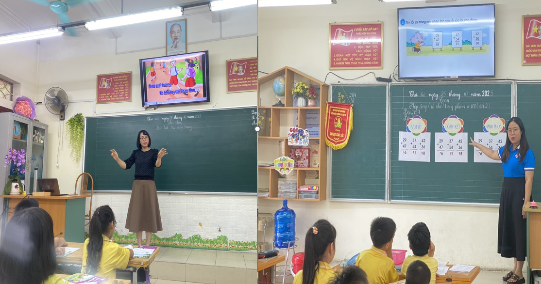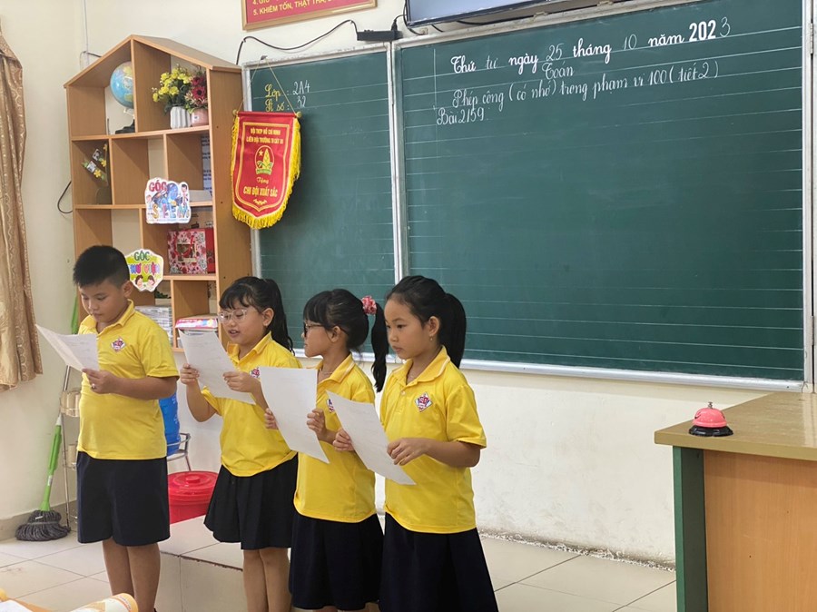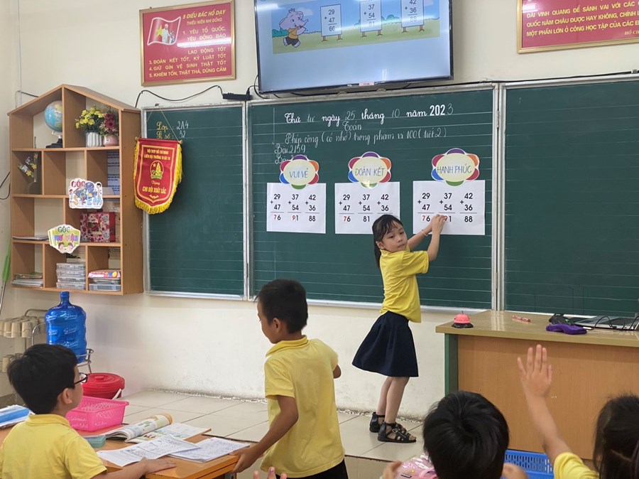 Thực hiện kế hoạch chuyên môn tháng 10, chiều thứ tư (25/10/2023), đ/c Hà Quỳnh Anh đã lên tiết chuyên đề chuyên môn cấp trường “Vận dụng linh hoạt các kĩ thuật dạy học tích cực nhằm phát huy năng lực giải quyết vấn đề và sáng tạo trong môn Toán cho học sinh lớp 2” với bài dạy: Phép cộng có nhớ trong phạm vi 100 (tiết 2) tại lớp 2A4. Qua tiết học này, HS được phát triển các năng lực chung cũng như năng lực đặc thù của môn Toán, đặc biệt các em được phát triển năng lực giải quyết vấn đề và sáng tạo thông qua việc chính các em được tham gia vào các hoạt động trong tiết học. Ví dụ: