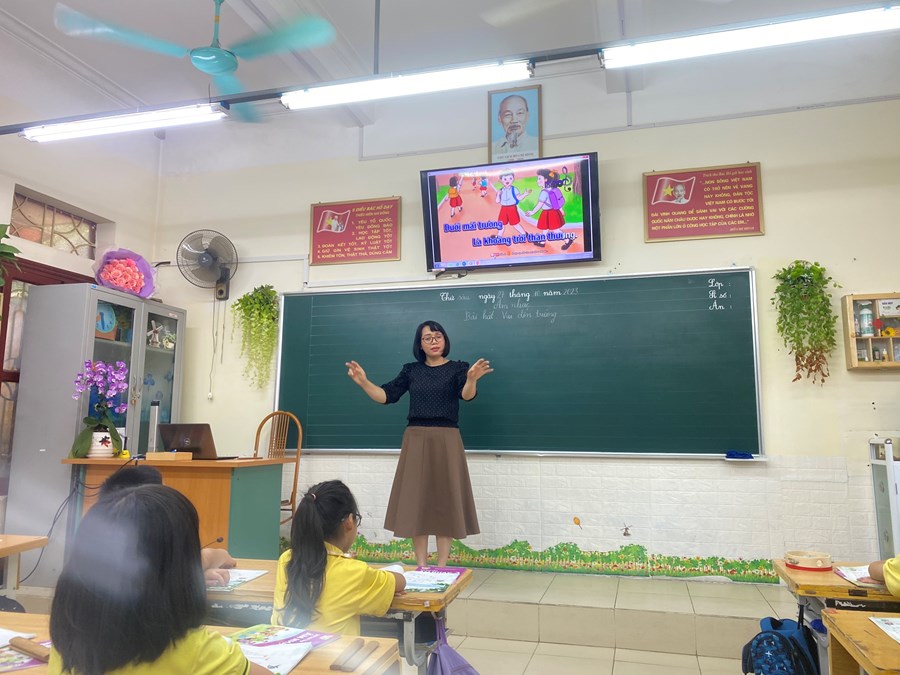Sáng thứ sáu (27/10/2023), đ/c Nguyễn Thị Thúy Hằng đã thực hiện tiết chuyên đề cấp trường môn Âm nhạc “Biện pháp phát huy tính tích cực, chủ động, sáng tạo của học sinh lớp 3 trong môn Âm nhạc”: Tiết 9 – Bài hát: “Vui đến trường”. Tiết dạy diễn ra sôi nổi, dưới sự dẫn dắt của cô giáo với nhiều hình thức dạy học phong phú, các em học sinh đều hào hứng, tích cực tham gia vào các hoạt động học tập.