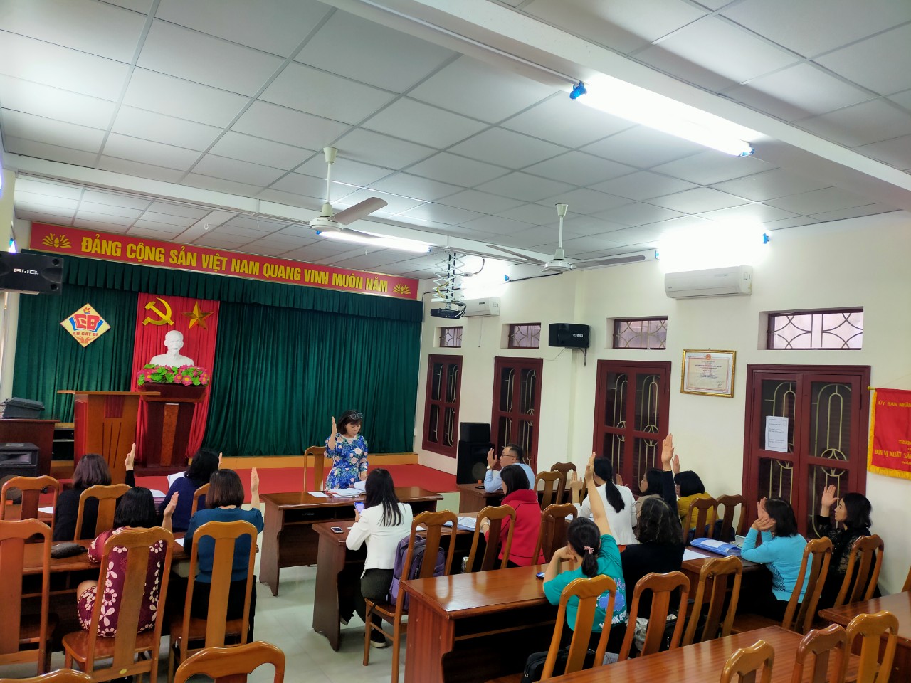Trước đó, nhà trường đã sớm triển khai kế hoạch và tổ chức cho tổ chuyên môn, giáo viên nghiên cứu các văn bản liên quan và các bản sách giáo khoa mới theo chương trình GDPT 2018. Thầy cô được yêu cầu chuẩn bị ý kiến bằng văn bản, nhận xét tính phù hợp của mỗi đầu sách theo từng môn học về quan điểm, mục tiêu xây dựng chương trình, yêu cầu cần đạt, nội dung giáo dục, phương pháp dạy học bám sát các tiêu chí lựa chọn. Tổ/nhóm chuyên môn tổ chức cuộc họp để các thành viên được thảo luận, đánh giá từng đầu sách, sau đó tiến hành bỏ phiếu kín.