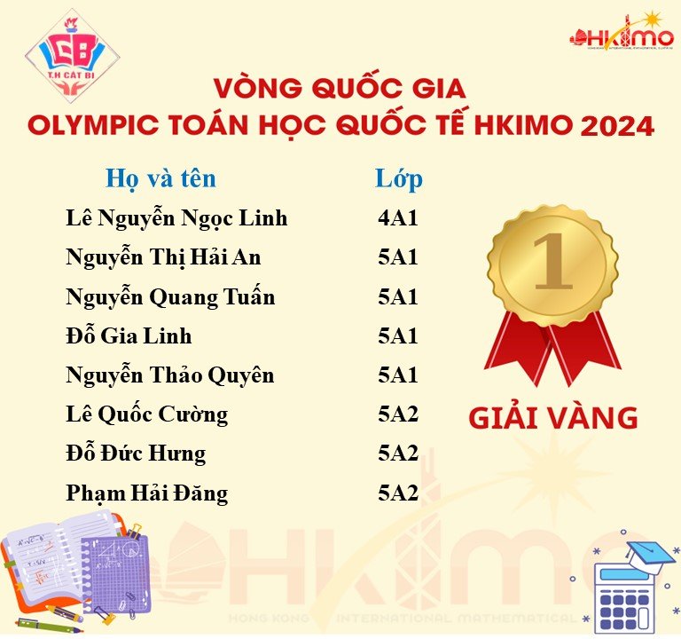 Sáng ngày 21/4/2024, các thí sinh của trường Tiểu học Cát Bi đã tham gia vòng chung kết quốc gia kỳ thi Olympic toán học quốc tế HKIMO 2024. Các em đã rất vui mừng, phấn khởi và đầy tự tin tham gia kỳ thi. Đây là cơ hội để các em được thử sức, trau dồi và học hỏi thêm nhiều kiến thức cũng như kỹ năng Toán học. Vì vậy mà các bậc phụ huynh cùng cô giáo đã luôn đồng hành với các em trong cuộc thi để các em có cơ hội phát triển năng lực của bản thân. Thông qua kỳ thi, các em được trải nghiệm, khẳng định khả năng của bản thân và cũng là tiền đề để phát hiện ra nhiều tài năng góp phần vào bề dày thành tích của nhà trường.