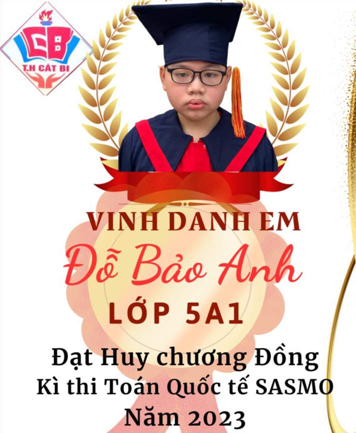 Cánh phượng nở đỏ rực bên góc sân trường. Càng về cuối năm học, các em học sinh lại rộn rã hẳn lên. Trong không khí vui mừng những ngày cuối năm học, cô và trò lớp 5A1 nói riêng và trường Tiểu học Cát Bi nói chung đã đón nhận rất nhiều những thành tích vang dội. Trong đó có em Đỗ Bảo Anh, học sinh lớp 5A1. Dưới sự dìu dắt tận tâm và đầy nhiệt huyết của cô giáo Vũ Thị Việt Thu - GVCN lớp 5A1, trong kì thi Toán Quốc tế SASMO năm 2023, em đã đạt giải Huy chương Đồng, ghi danh vào trang vàng vinh dự của trường Tiểu học Cát Bi.