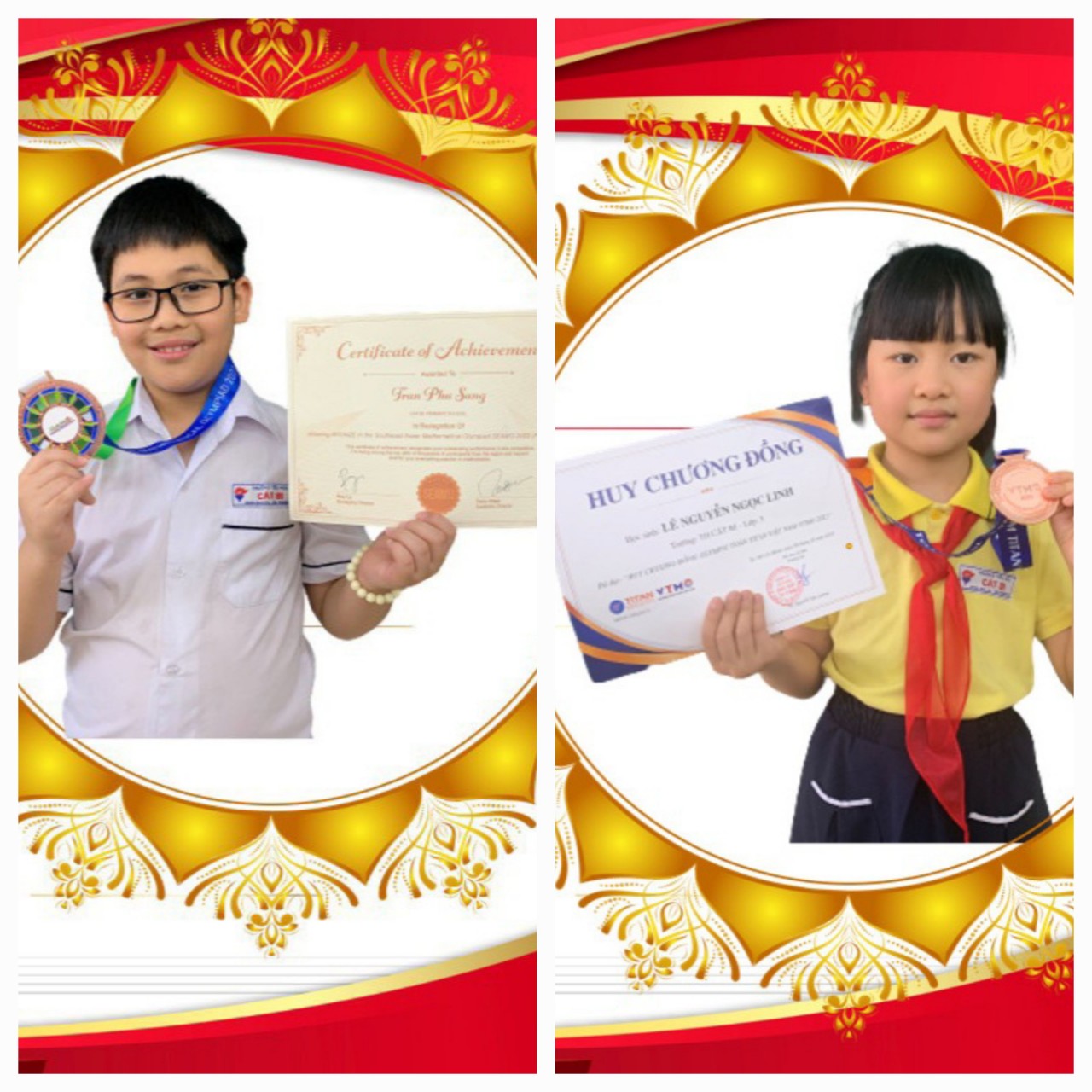Tiếp theo những thành tích đạt được từ cuộc thi Thách thức tài năng Toán học Việt Nam 2023, thầy và trò Trường Tiểu học Cát Bi vô cùng phấn khởi và tự hào về kết quả đạt được của các em: Lê Nguyễn Ngọc Linh đạt Huy chương Đồng tại cuộc thi Olympic Toán TITAN Việt Nam (VTMO) và em Trần Phú Sang đạt Huy chương Đồng cuộc thi Olympiad SEAMO