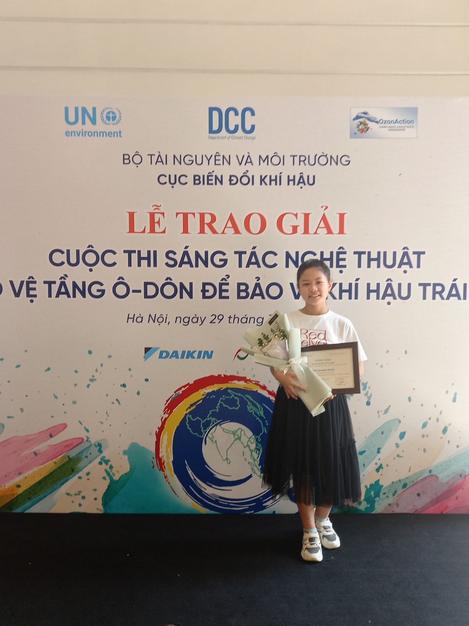 Hôm nay, thứ 6 ngày 29/7/2022, em Nguyễn Thị Kim Ngân – học sinh lớp 4A2 đạt giải Khuyến Khích toàn quốc (thể loại tranh vẽ dưới 15 tuổi) vinh dự được tham gia Lễ trao giải và Triển lãm trưng bày các tác phẩm đạt giải Cuộc thi sáng tác nghệ thuật với chủ đề “Bảo vệ tầng ô-dôn để bảo vệ khí hậu Trái đất” tại Khách sạn Daewoo, Hà Nội.