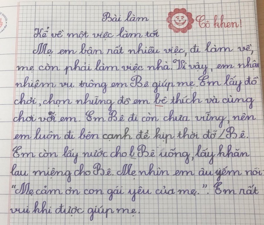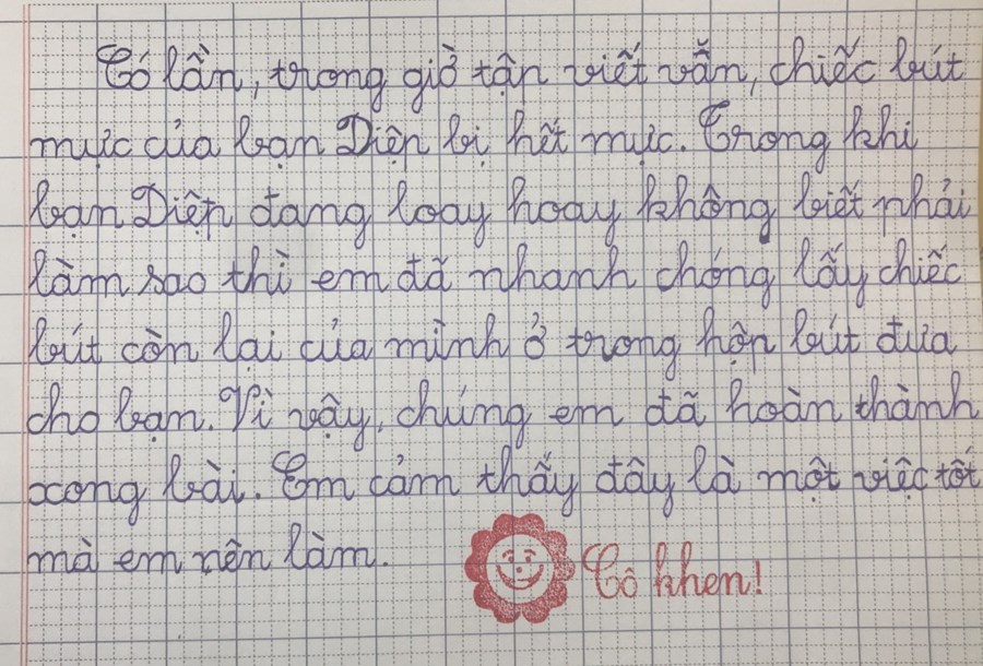 Thực hiện phong trào phát động thi đua của Liên đội, các em học sinh lớp 2A2 rất hào hứng tham gia làm việc tốt. Đặc biệt, cuối mỗi ngày, các em đều ghi lại những việc làm tốt của mình vào sổ nhật kí. Thầy cô và bố mẹ hài lòng về các em lắm! Trong giờ học Tiếng Việt hôm nay với bài tập “Viết đoạn văn ngắn kể về một việc làm tốt của em”, cả lớp reo lên vui sướng vì mình có cơ hội chia sẻ cùng nhau về những việc tốt đã làm. Nhìn ngắm những nét chữ xinh xinh, đọc những câu văn chân thật mà dễ thương của các em, cô giáo cảm động biết bao!