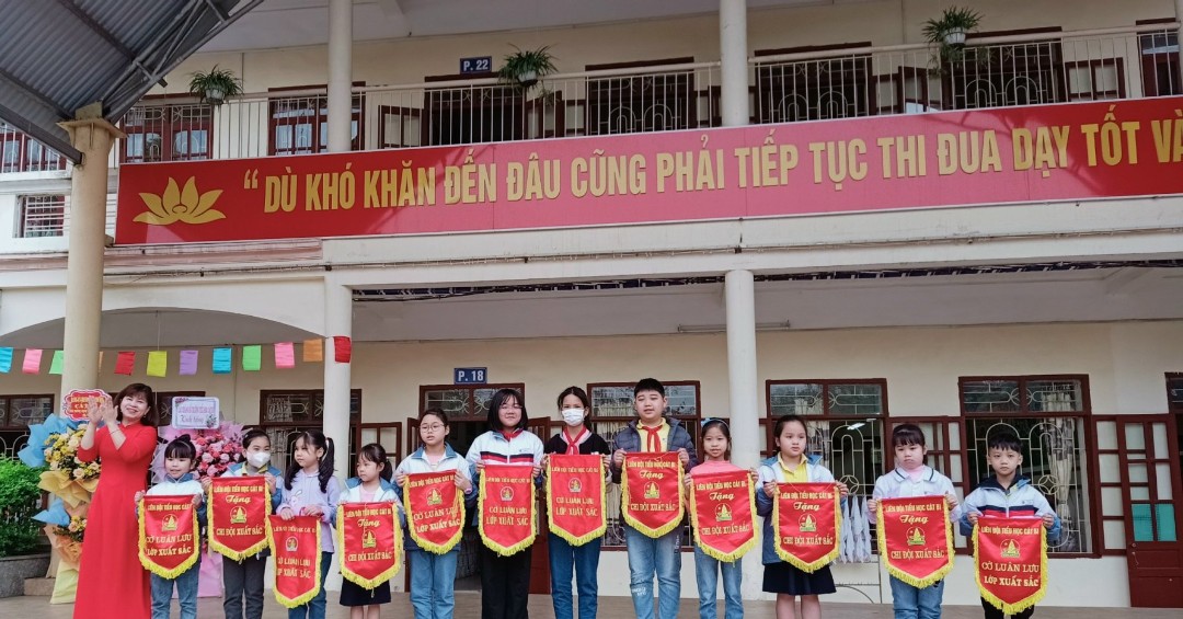 Cô giáo Nguyễn Thị Phương - Hiệu trưởng nhà trường trao cờ luân lưu cho các Chi đội xuất sắc trong tháng 2
