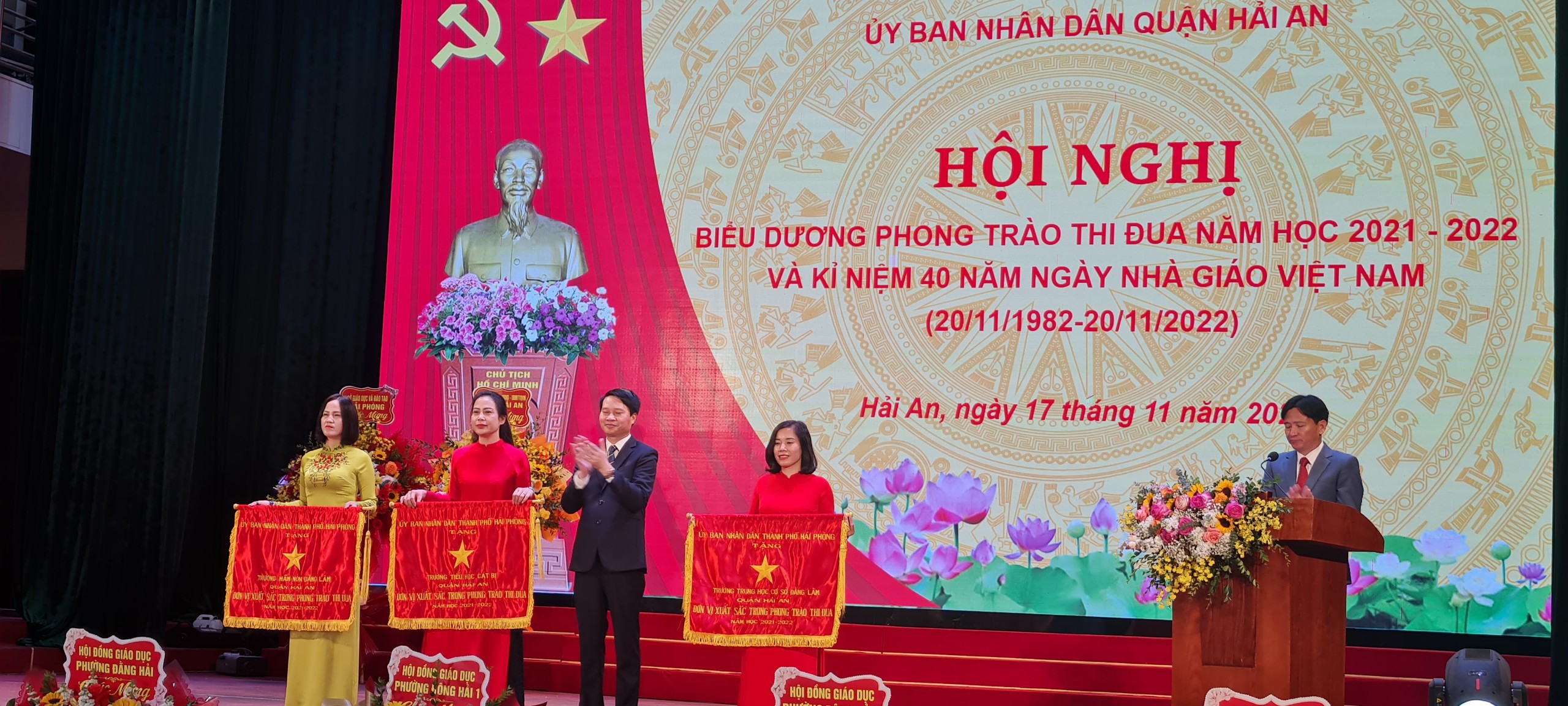Sáng thứ năm - ngày 17/11/2022, UBND quận Hải An tổ chức Hội nghị Biểu dương phong trào thi đua năm học 2021-2022 và kỷ niệm 40 năm ngày Nhà giáo Việt Nam (20/11/1982-20/11/2022). Hội nghị vinh dự được chào đón các đại biểu: Đ/c Đỗ Văn Lợi - Phó GĐ Sở GD&ĐT, Đ/c Nguyễn Hoàng Bí - Phó Trưởng ban thi đua và khen thưởng Sở Nội vụ; Đ/c Nguyễn Văn Tuấn – Bí thư Quận Uỷ; Đ/c Dương Đình Ổn - Chủ tịch UBND quận; Đ/c Trần Thị Kim Oanh - Phó Chủ tịch quận; Đ/c Nguyễn Anh Tuấn - Phó Bí thư Quận uỷ cùng các đồng chí Bí thư, Chủ tịch HĐND, Chủ tịch UBND, Chủ tịch HĐGD phường, Ban Giám hiệu, Chủ tịch Công đoàn các trường: Mầm non, Tiểu học, Trung học cơ sở; đại diện tập thể, giáo viên được biểu dương, khen thưởng năm học 2021-2022; “Nhà giáo tâm huyết, sáng tạo”, các em học sinh có thành tích cao được biểu dương, khen thưởng