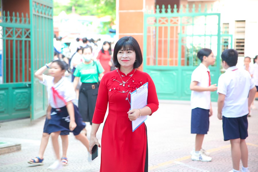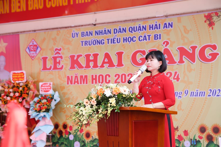 Cô giáo Nguyễn Thị Phương - Bí thư chi bộ - Hiệu trưởng trường Tiểu học Cát Bi đọc diễn văn Khai giảng năm học 2023- 2024