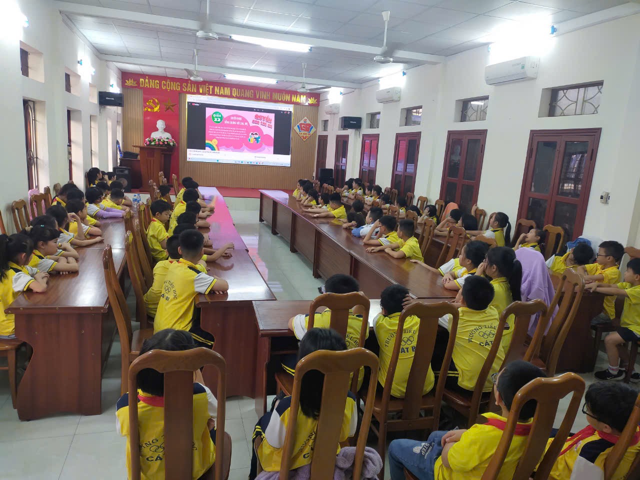 Buổi tập huấn có sự tham dự của cô giáo Đinh Thị Hằng - GV Tổng phụ trách cùng một số cô giáo trong nhà trường và các em học sinh đại diện các khối 1,2,3,4,5 trong trường. Trong buổi tập huấn, các em được giới thiệu về các quyền cơ bản của trẻ em theo Công ước Liên hợp quốc như: quyền được học tập, vui chơi, quyền được bảo vệ và quyền bày tỏ ý kiến. Để nội dung trở nên sinh động và dễ hiểu, nhà trường đã sử dụng nhiều hình thức trình bày phong phú. Các hoạt động này không chỉ giúp học sinh nắm bắt kiến thức mà còn khơi dậy sự hứng thú, tạo không khí sôi nổi và gần gũi. Buổi tuyên truyền đã giúp các em học sinh nhận thức rõ ràng hơn về quyền lợi và nghĩa vụ của mình, đồng thời biết cách tự bảo vệ bản thân trước những tình huống nguy hiểm. Không chỉ vậy, thông qua buổi tập huấn này, các em còn được trang bị kỹ năng xử lý tình huống, giúp hình thành thói quen sống có trách nhiệm với bản thân, gia đình và xã hội.