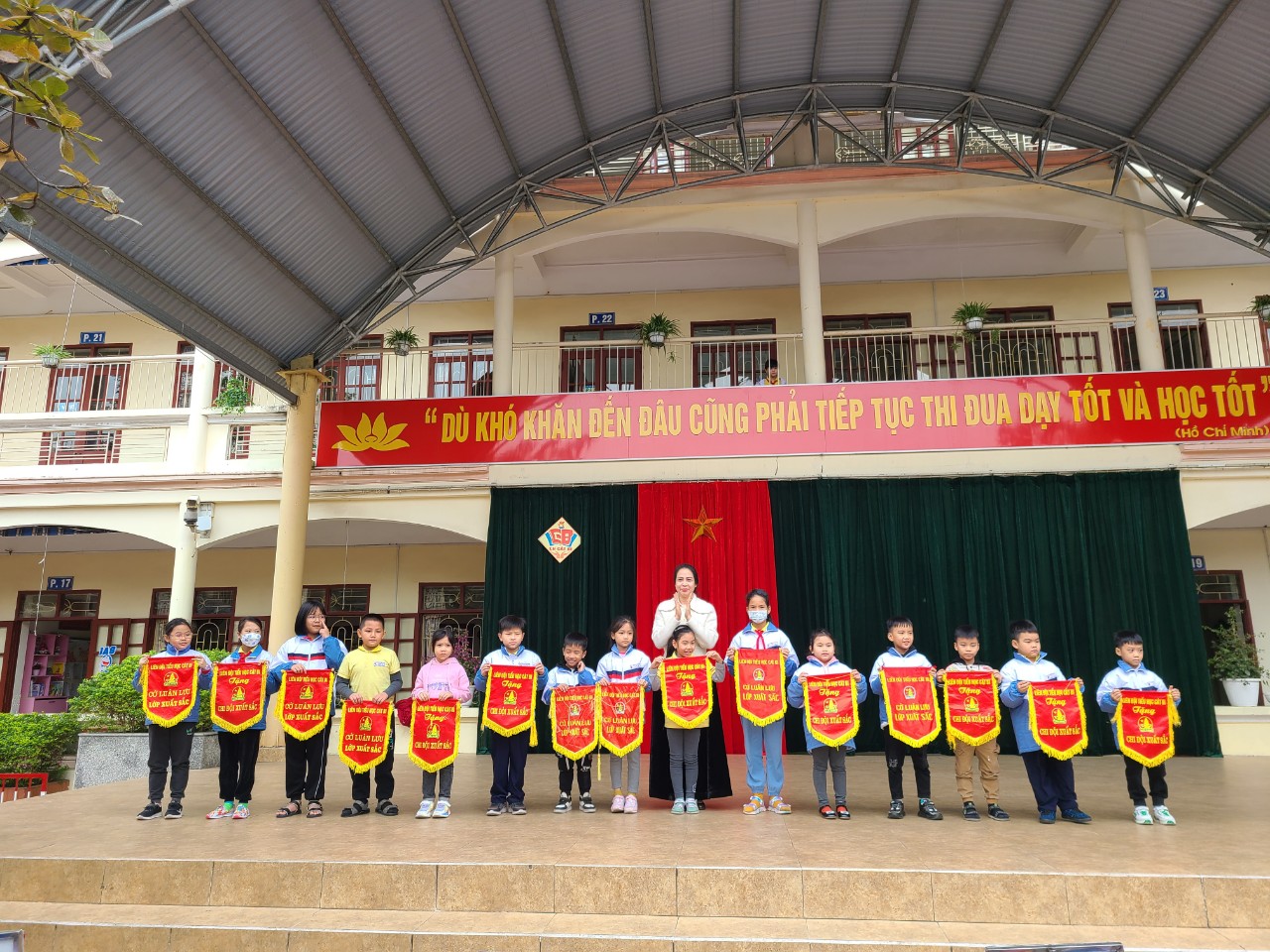 Cô giáo Phạm Thị Thúy Hải - Hiệu trưởng nhà trường trao cờ luân lưu cho các lớp xuất sắc