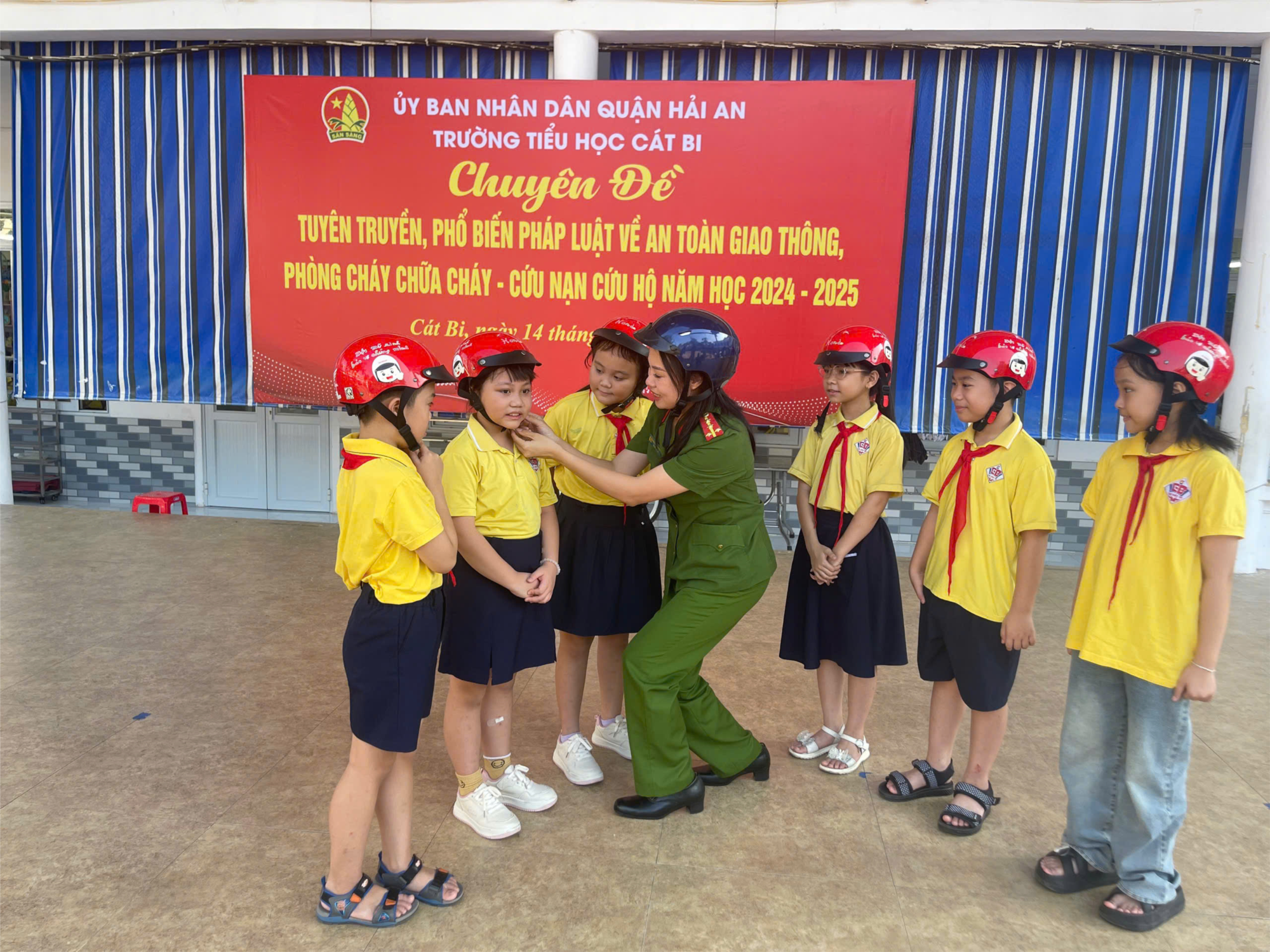 Căn cứ Quyết định số 4458/QĐ-BGDĐT ngày 22/8/2007 của Bộ trưởng Bộ Giáo dục - Đào tạo ban hành Quy định về xây dựng trường học an toàn, phòng chống tai nạn, thương tích trong trường phổ thông. Ngày 14/10/2024, Trường Tiểu học Cát Bi phối hợp với công an quận Hải An, Uỷ ban nhân dân phường Cát Bi, Công an phường Cát Bi tổ chức tuyên truyền, quản lý về an toàn giao thông, phòng cháy chữa cháy - cứu hộ cứu nạn. Về dự chuyên đề, nhà trường vinh dự đón tiếp đ/c Đại uý Bùi Hồng Mạnh - Tổ trưởng tổ tuyên truyền, đ/c Đại uý Nguyễn Cẩm Dung - Cán bộ Đội CSGT-CA quận Hải An, đ/c Thượng uý Mai Văn Quang - Cán bộ Đội Cảnh sát PCCC-CA quận Hải An, đ/c Nguyễn Thị Phương - Bí thư Chi bộ, Hiệu trưởng nhà trường, đ/c Nguyễn Thị Hà Giang - Phó Hiệu trưởng, đ/c Trần Thị Minh Ngọc - Phó Hiệu trưởng cùng toàn thể các em học sinh, CB, GV, NV toàn trường.