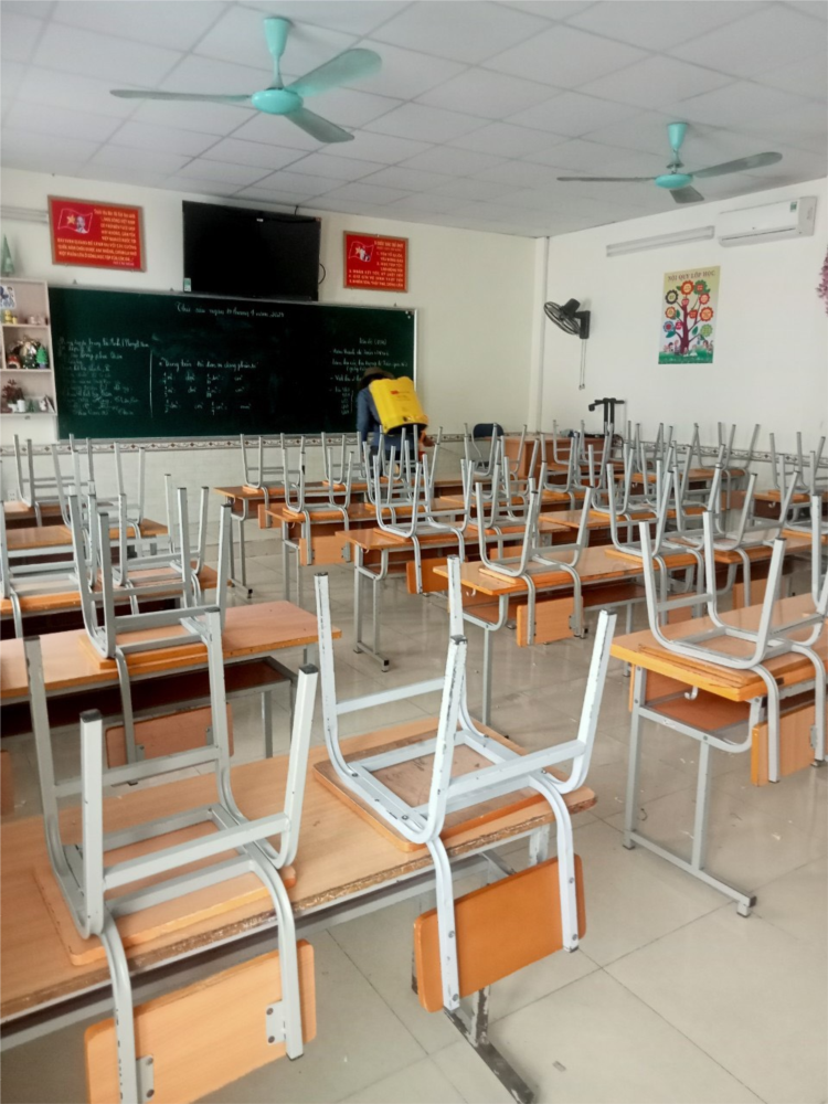 Để chuẩn bị tốt cho công tác phun thuốc muỗi, các lớp trong nhà trường đã thu dọn gọn gàng đồ dùng giảng dạy và học tập, bình nước và giá đựng cốc, tất cả được che chắn để đảm bảo vệ sinh.