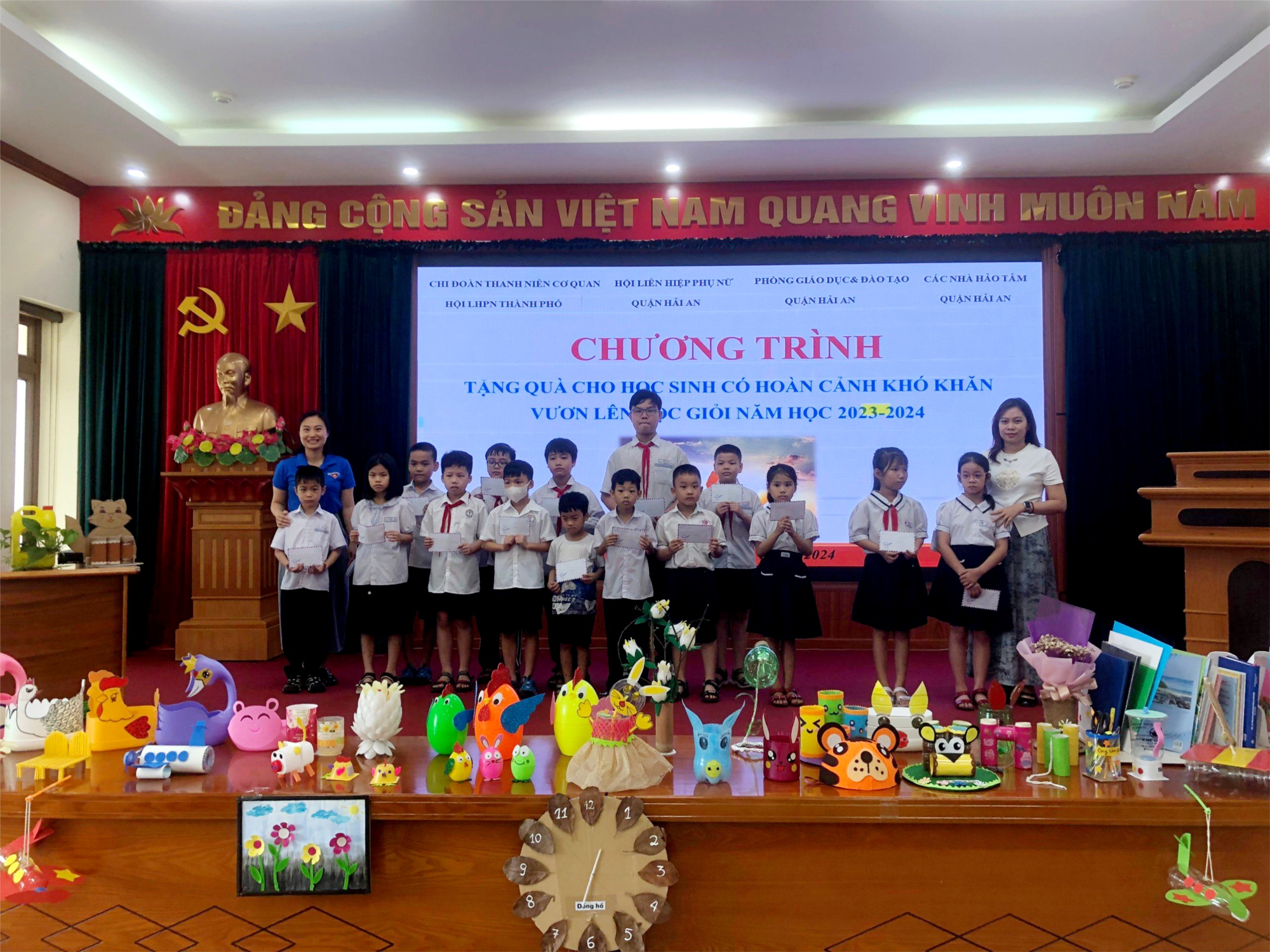 Sáng ngày 17/5/2024, Hội Hội Liên hiệp Phụ nữ quận Hải An phối hợp với Chi đoàn thanh niên Hội LHPN TP, Phòng GD&ĐT quận tổ chức trao tặng 80 suất quà cho các em có hoàn cảnh khó khăn vươn lên học giỏi năm học 2023 - 2024.