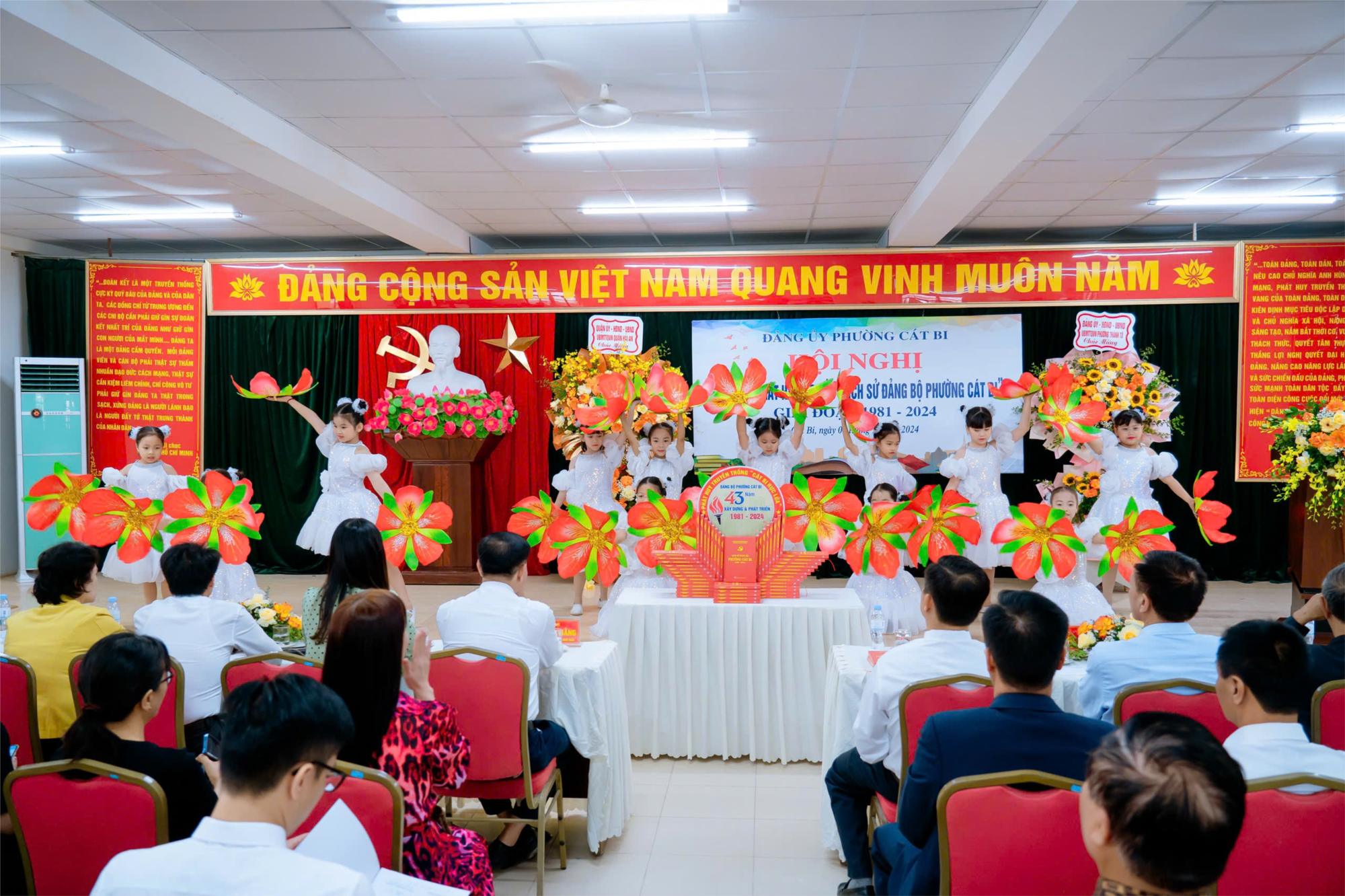 Trong khuôn khổ hội nghị, Trường Tiểu học Cát Bi đã vinh dự được chọn làm đại diện cho khối học sinh trên địa bàn phường tham gia chương trình văn nghệ chào mừng. Các em học sinh đã biểu diễn tiết mục múa "Em là mầm non của Đảng" của nhạc sĩ Mộng Lân, cùng với bài hát "Như có Bác Hồ trong ngày vui đại thắng" của nhạc sĩ Phạm Tuyên. Những tiết mục này không chỉ thể hiện lòng biết ơn sâu sắc, niềm kính trọng đối với Đảng, mà còn mang lại bầu không khí vui tươi, rộn ràng cho hội nghị. Sự hồn nhiên, trong sáng của các em đã góp phần làm cho Hội nghị thêm phần trang trọng, đồng thời thể hiện sự kết nối giữa thế hệ trẻ hôm nay với những giá trị truyền thống tốt đẹp của Đảng bộ phường Cát Bi.