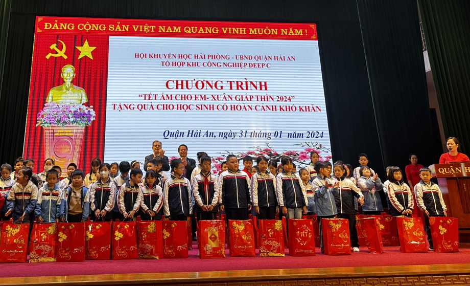 Chiều ngày 31/ 02/ 2024, hội Khuyến học thành phố kết hợp với công ty DEEP C tổ chức chương trình “Tết ấm cho em – Xuân Giáp Thìn” tặng quà cho học sinh có hoàn cảnh khó khăn của quận Hải An. Đến dự có ông Hoàng Duy Đỉnh – Chủ tịch hội khuyến học thành phố Hải Phòng, ông Roben – Đại diện tổ hợp khu công nghiệp DEEP C, bà Trần Thị Kim Oanh – Chủ tịch hội khuyến học quận Hải An, các ông bà Ủy viên ban khuyến học quận, Hiệu trưởng các trường, các báo Hải Phòng đến dự và đưa tin cùng các em học sinh Tiểu học, Trung học cơ sở trên địa bàn quận đến dự. Trường Tiểu học Cát Bi có 15 em học sinh có hoàn cảnh khó khăn được nhận quà.