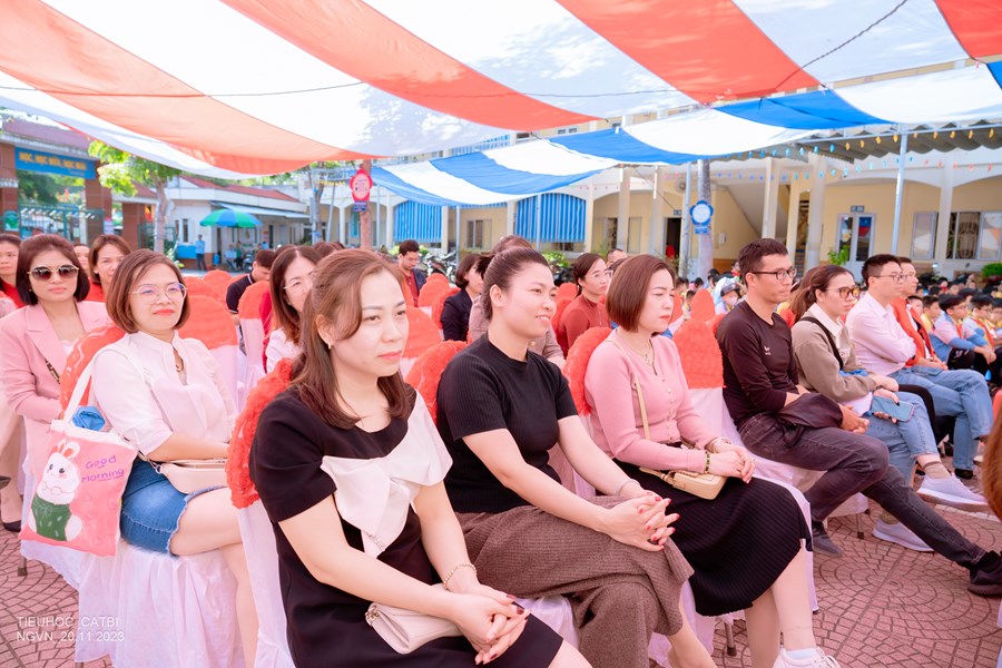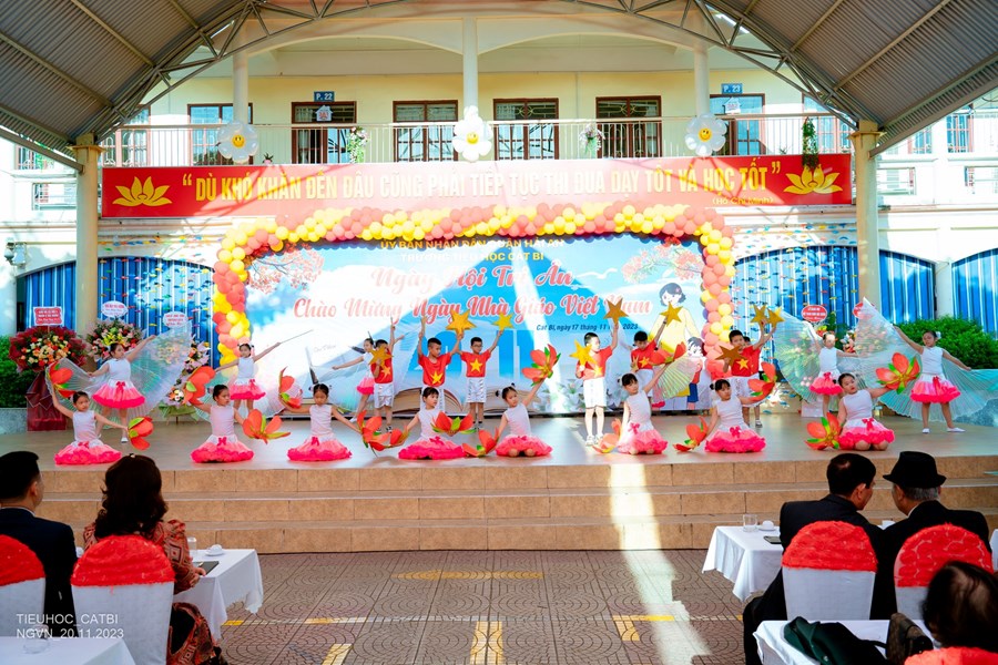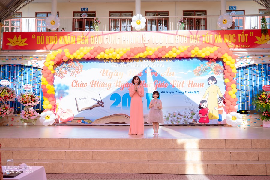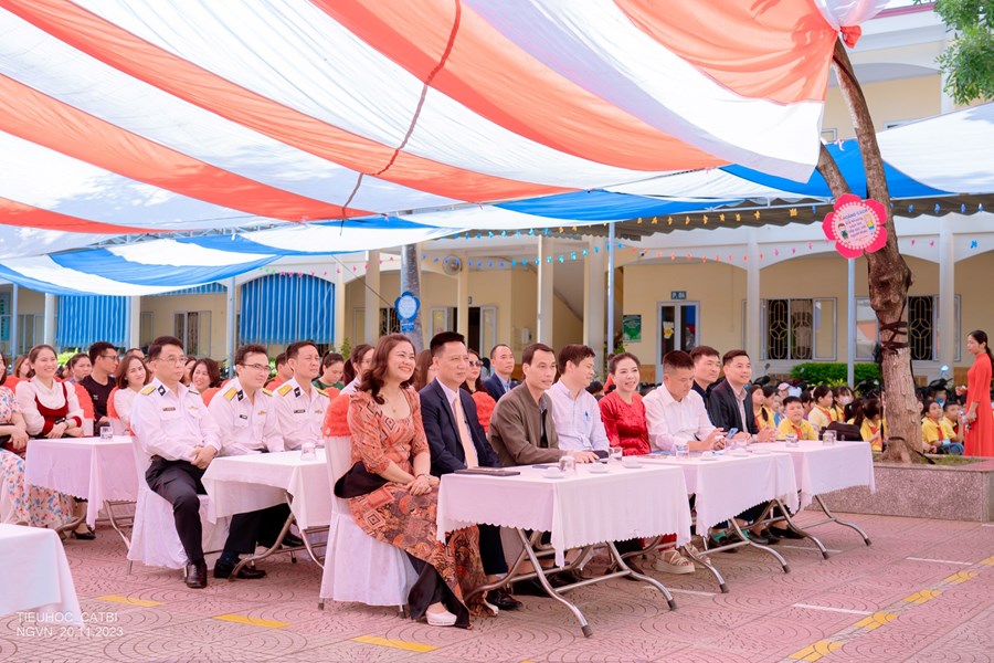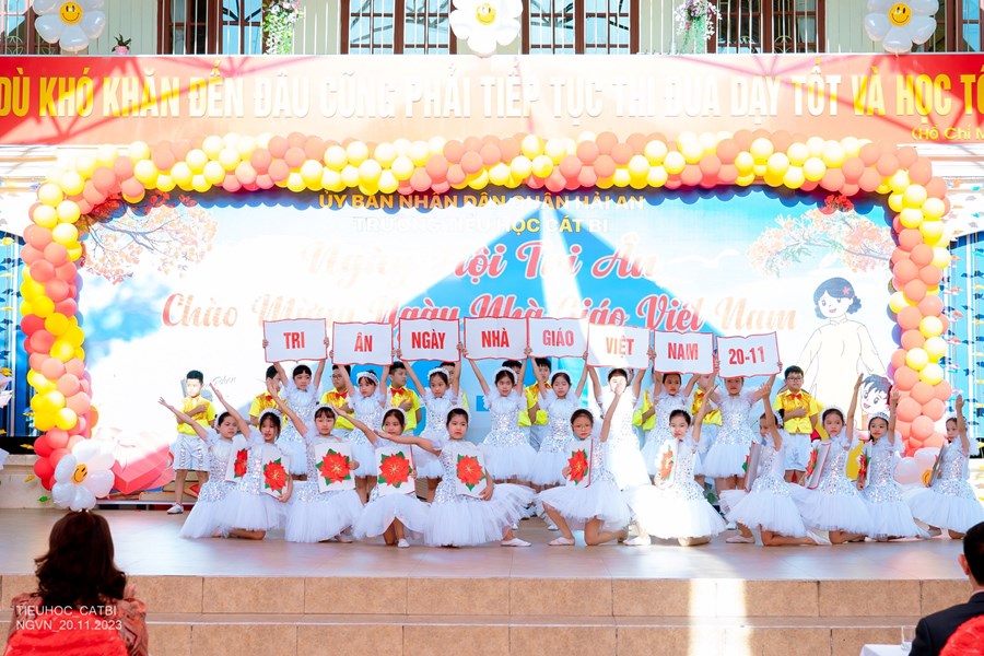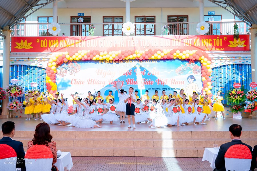 Nguyễn Mạnh Thắng - Phó Chủ tịch UBND phường Cát Bi, đ/c Nguyễn Quốc Hưng - Phó Chủ tịch UBND phường Cát Bi và các ban ngành đoàn thể trên địa bàn phường, các đơn vị kết nghĩa; các thầy cô giáo thuộc các thế hệ nhà giáo đã nghỉ hưu, đã chuyển công tác; Các cô bác trong Ban thường trực; 44 Chi hội PH các lớp cùng toàn thể CB-GV-NV nhà trường và các em học sinh khối 4 – đại diện cho các em HS toàn trường. Mở đầu chương trình là các tiết mục văn nghệ đặc sắc đến từ các em học sinh các khối lớp của nhà trường. Đây là tình cảm, là món quà lớn mà các em kính tặng các quý vị đại biểu và thầy cô.